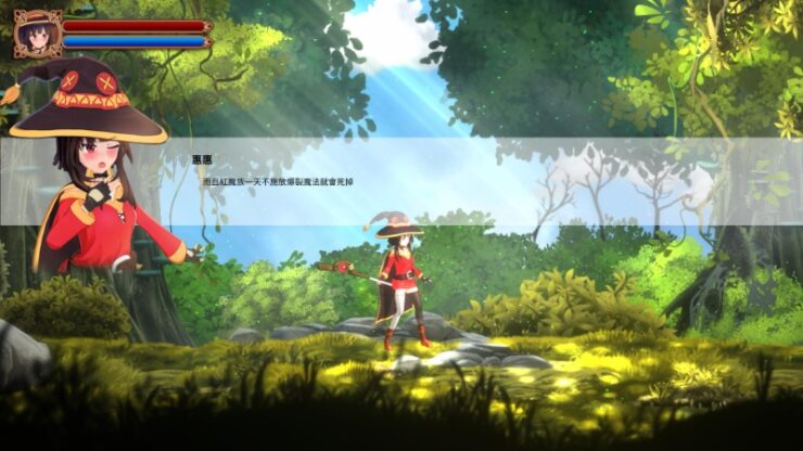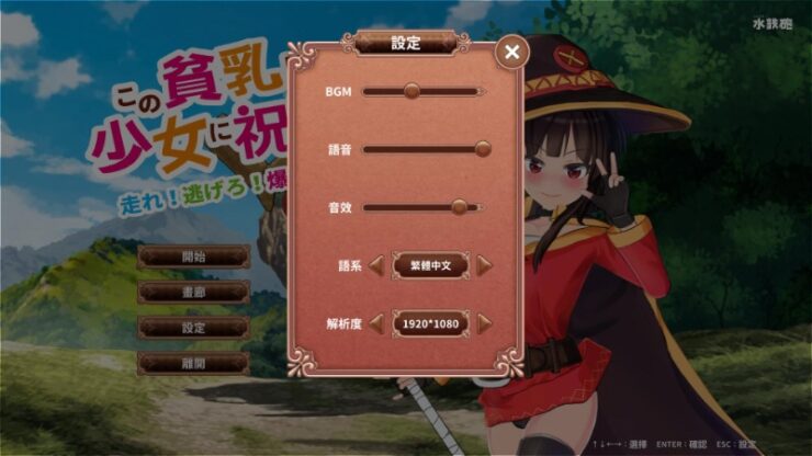 为美好的世界献上祝福同人游戏。大致游戏内容就是先操纵惠惠躲避怪物奔跑到指定的安全地点,然后来一发爆裂火球消灭敌人。游戏还是挺简单的,只要不被怪物抓住,感觉很像跑酷游戏……三种语言,打开设定切换语言即可